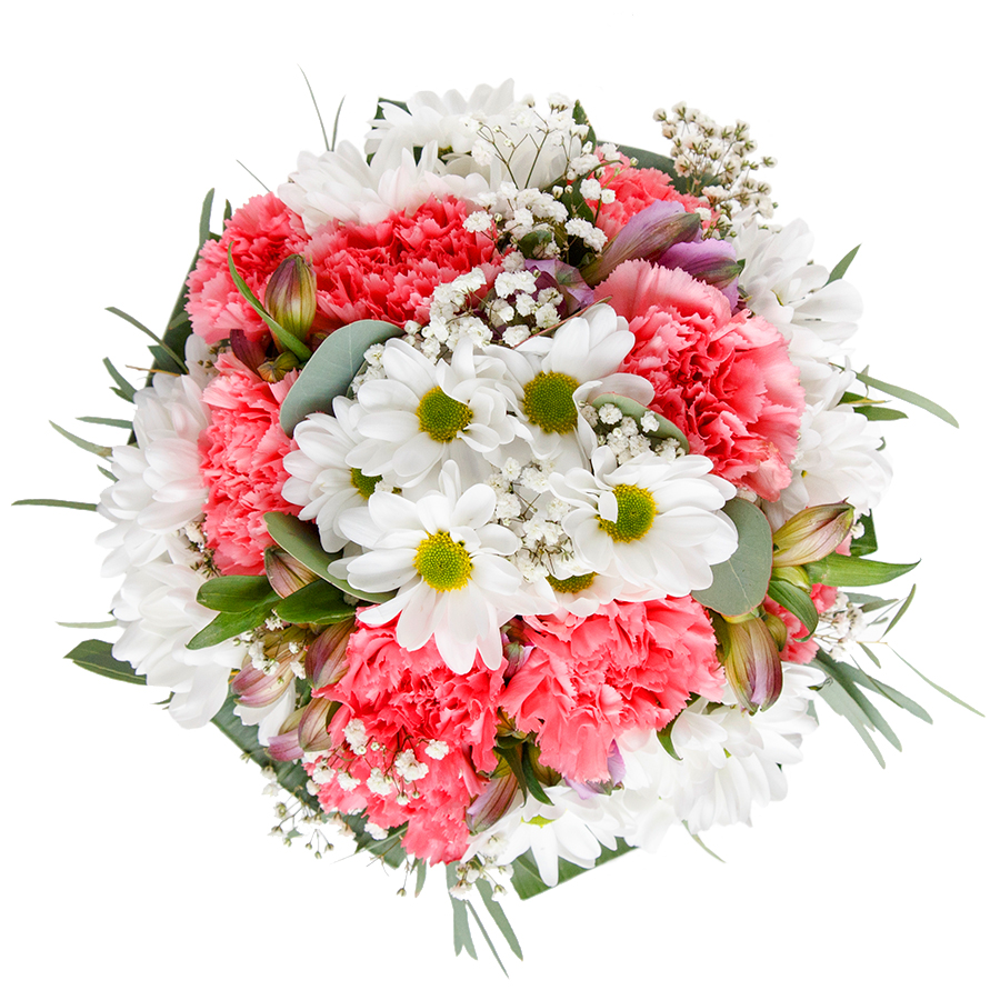 Bring grace and beauty to any occasion with our Graceful Elegance Arrangement. This exquisite bouquet combines snow-white chrysanthemums, ethereal gypsophila, and soft light pink carnations, enhanced by the lushness of aspidistra leaves.